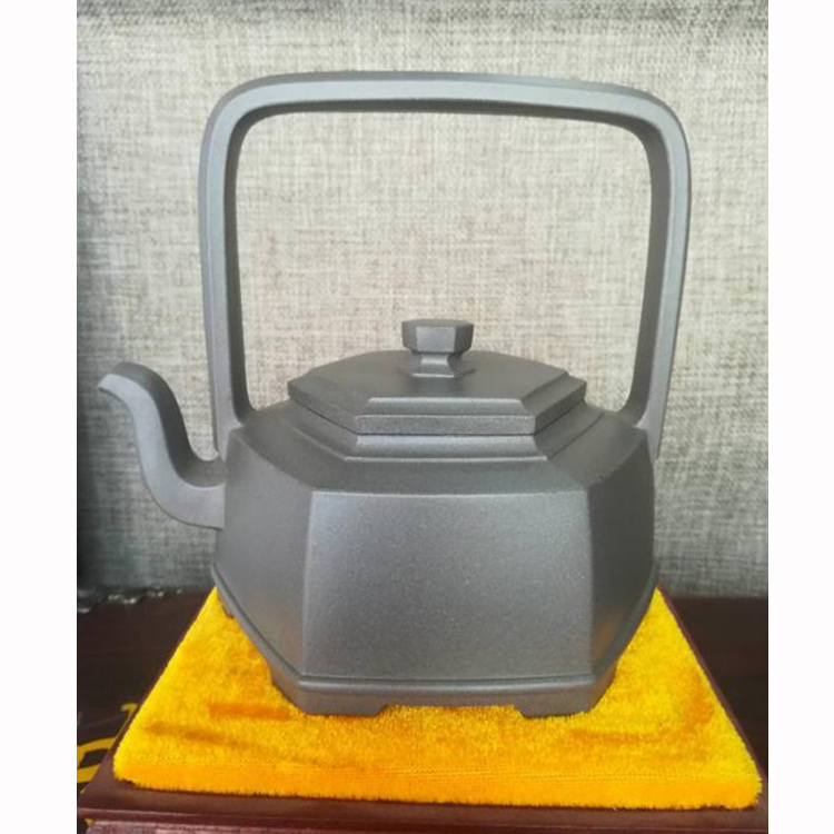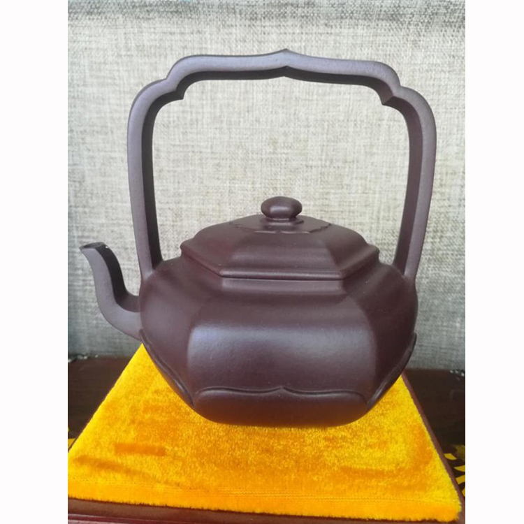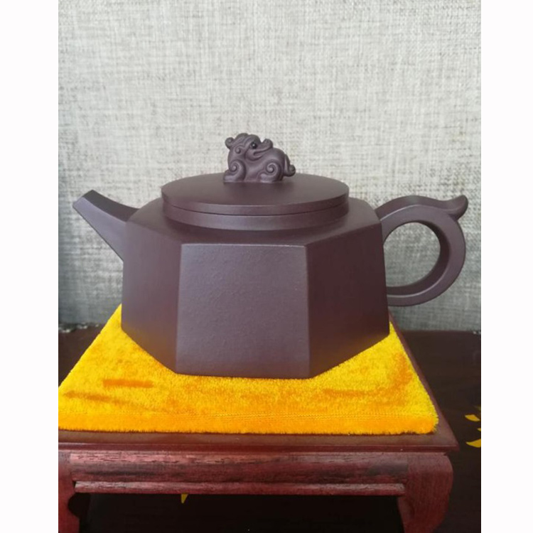 作品简介:此壶造型中规中矩,古朴沉静。壶身为六面方形,壶盖,壶口,壶提子均为六边形,与壶身形状一致。壶底六个转脚使整壶看起来不仅美观,更具稳定之感。提梁为方形,与壶身完美结合,彰显此壶沉稳,静态之美。整壶做工细致入微,浑然天成,观赏性大于实用性,是收藏佳品。