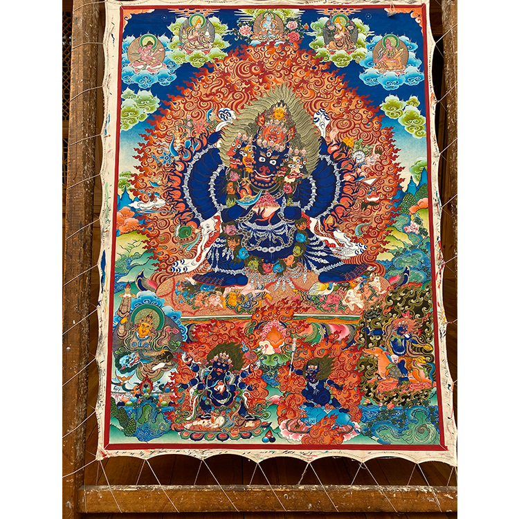 作品简介:唐卡(彩绘)色彩艳丽,画面饱满,所绘内容是大威德金刚,大威德金刚是格鲁派密宗所修本尊之一,因其能降服恶魔,故称大威,又有护善之功,故又称大德。梵名“阎魔德迦”(英语:Yamāntaka),藏语为”多吉久谢”, 日本东密称为“大威德明王”。也叫阎曼德迦、怖畏金刚、牛头明王。