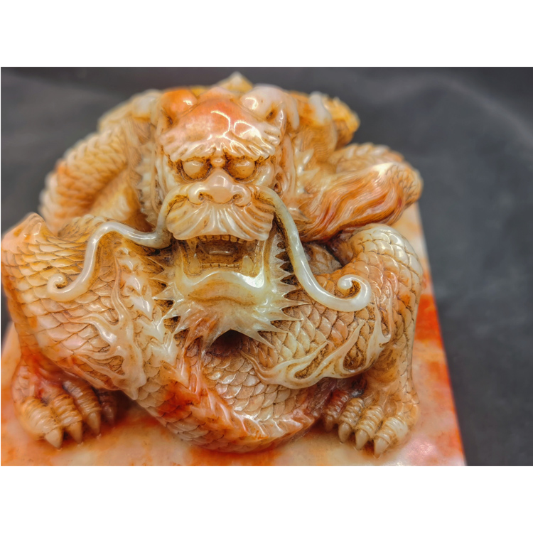 作品简介:印玺由龙钮和玺基两部分组成,龙钮身形遒劲有力,鳞片丰满整齐,龙须丝丝清晰,头部刻画入微,双目专注有神,神态威猛张扬,有气势磅礴之感。玉玺玺基方正,体现了天圆地方的中华传统文化,也象征着帝王脚踏四方、统御山河的威势。龙玺,在中国古代是王者信物,是至高无上权利与威严的象征,得龙玺者,受命于天,福寿永昌。