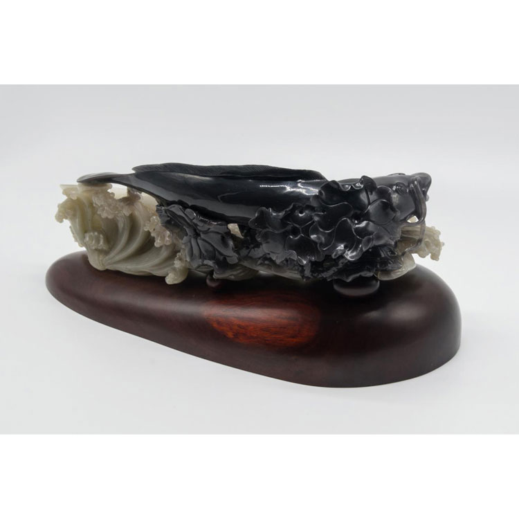 作品介绍:《相濡以沫》这件作品只有黑白两色,颜色对比非常强烈,玉质温润,属于密玉里面高品质玉料。俏色处理的干净利落,黑白分明没有出现过渡色。创作思路根据《庄子·大宗师》:“泉涸,鱼相与处于陆,相呴以湿,相濡以沫,不如相忘于江湖。”这篇文章构思出了,两条鱼经过千难万险回到大海的场面。利用黑白两色分别设计成两条鲶鱼,它们相濡以沫,不离不弃。再加上水花边的水草与荷叶,又给这副作品增添了几分生活气息。体现了夫妻间真挚、纯洁的爱情和相濡以沫的这种意境。(该作品已被中国工艺美术博物馆永久收藏)