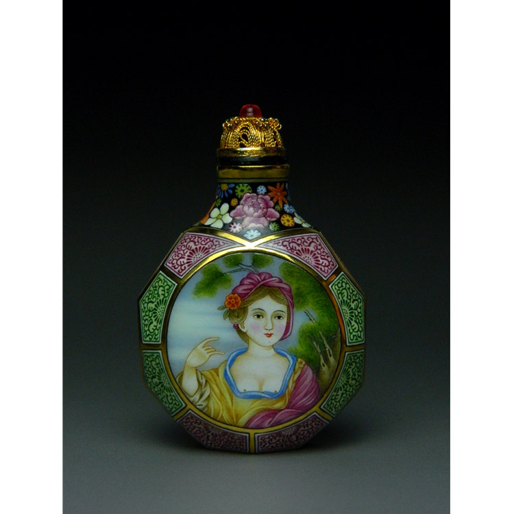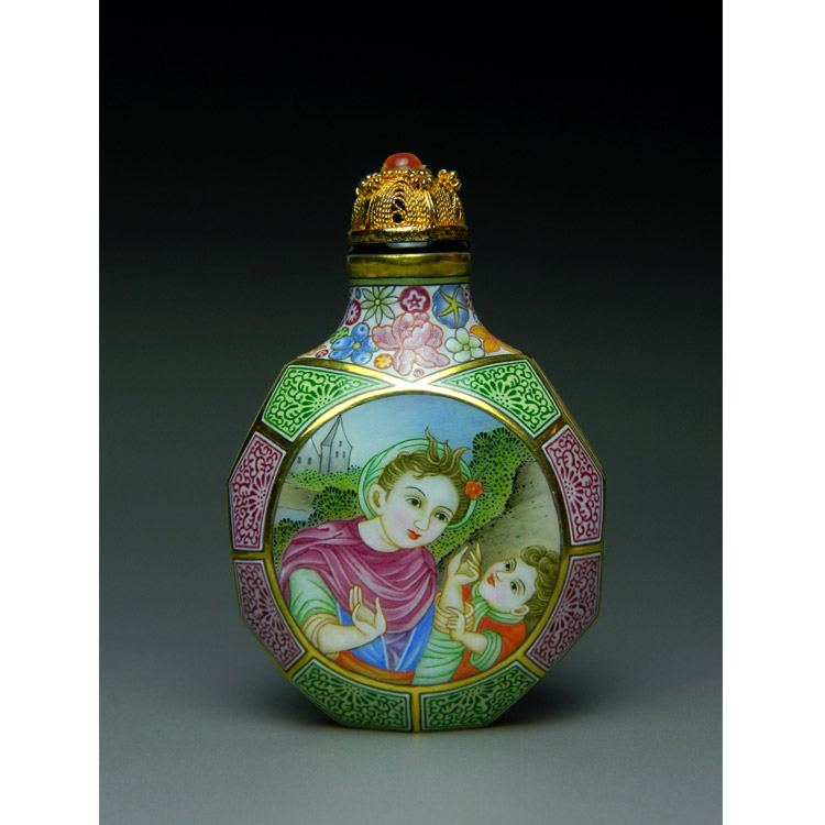 作品介绍:玻璃料胎材质,壶身主体两面圆形开光,内绘母子图。圆形开光外为二十三个不规则棱面绘卷草菊瓣图案,棱面之间以镀金边间隔;颈部满饰万花锦。底书“由风华制”蓝料堆款。人物题材是“古月轩”中难度最大的一种。多棱壶形的构图非常讲究,必须达到各棱面对称。绘制工艺复杂,需经多次入炉烧制,方可达到最佳效果。