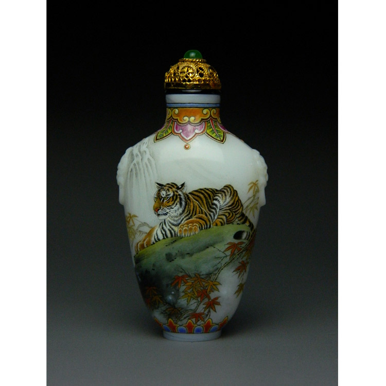 作品介绍:玻璃料胎材质,吸取其他艺术技艺,创新开发出运用特殊丝毛画法。绘制出老虎、雄鸡、猫咪的质感与神态。底书“由风华制”蓝料堆款。