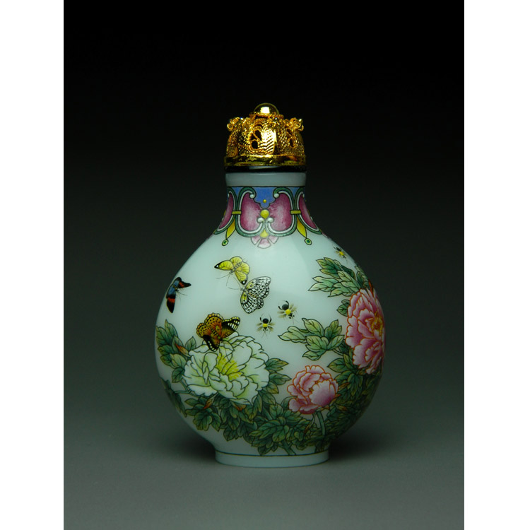 作品介绍:玻璃料胎材质,各绘有鲤鱼荷花、鹦鹉、牡丹盛开及彩蝶翩舞。其色泽明亮艳丽,画工精细圆润,极具富丽堂皇的宫廷风格。底书“由风华制”蓝料堆款。蝴蝶被人们誉为“会飞的花”,又被作为长寿的借指。牡丹象徵富贵