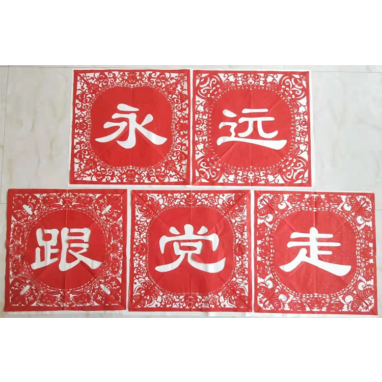 作品简介:建党100年,创作一组党政题材的团花,中间隶体字“永远跟党走”边沿搭配的有寿桃、蝙蝠、如意等吉祥符号。祝愿祖国繁荣昌盛。