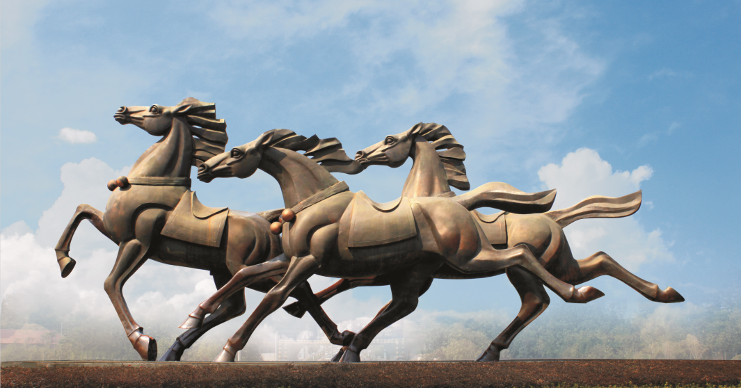 创作灵感:作品创意起源于“永康”名称由来的美丽传说:公元245年,三国东吴太乘三马九铃之御辇来上浦乡进香许愿,祈祷永保安康,因而孙权置县命名永康。三匹古马造型,突出皇家御马的威武和奔跑的意境,以史诗般的英雄主义,激励永康人为建设新永康而奋斗。