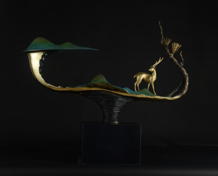 作品描述:熔铜重在创意,让铜在高温下自由流淌,形成千姿百态的肌理,超现实主义的意象,独一无二。作品松姿俊秀奇美,彰显福地人杰地灵,生机嫣然的灵秀之气,松树摇曳的身影,华丽而不俗艳,颇有意境之美。