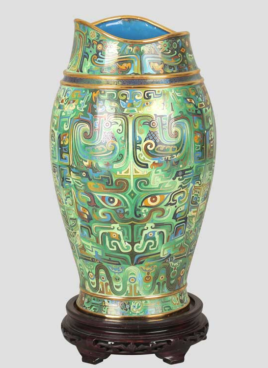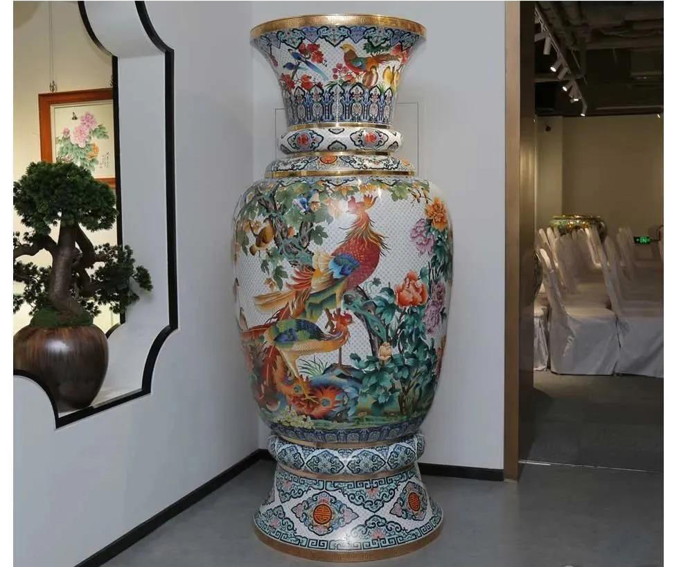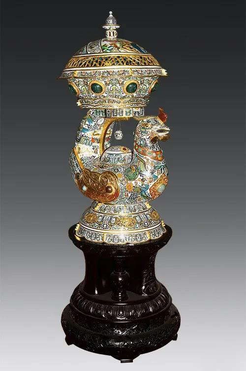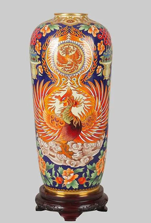 作品借鉴奥运场馆鸟巢为部分造型,寓意“百鸟还巢”。作品用景泰蓝錾雕镂空金、玉镶嵌珐、琅烧蓝等多种工艺相结合。