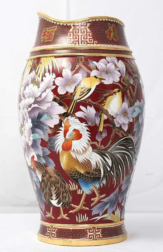 作品星空瓶之紫叶裹红,瓶身底色为象征吉祥的中国红,瓶身画面以盛开的紫色繁花和神采奕奕的雄鸡构成一幅妙趣横生的画面,寓意繁花似锦,盛世繁花,雄鸡展翅,大吉大利。