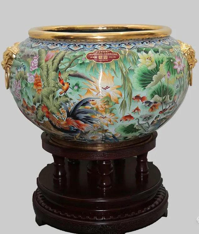 作品造型简洁,线条流畅,缸身描绘了盛夏时节,荷花千姿百态有的只有一个清理泛白的花苞,娇羞欲语,含苞欲放;有的只开了一半,另一些簇拥在花蕊旁;有的荷花全部盛放,犹如一位粉衣仙子随风翩翩起舞……荷花深处,鸳鸯戏水,一派悠然闲事的景象。