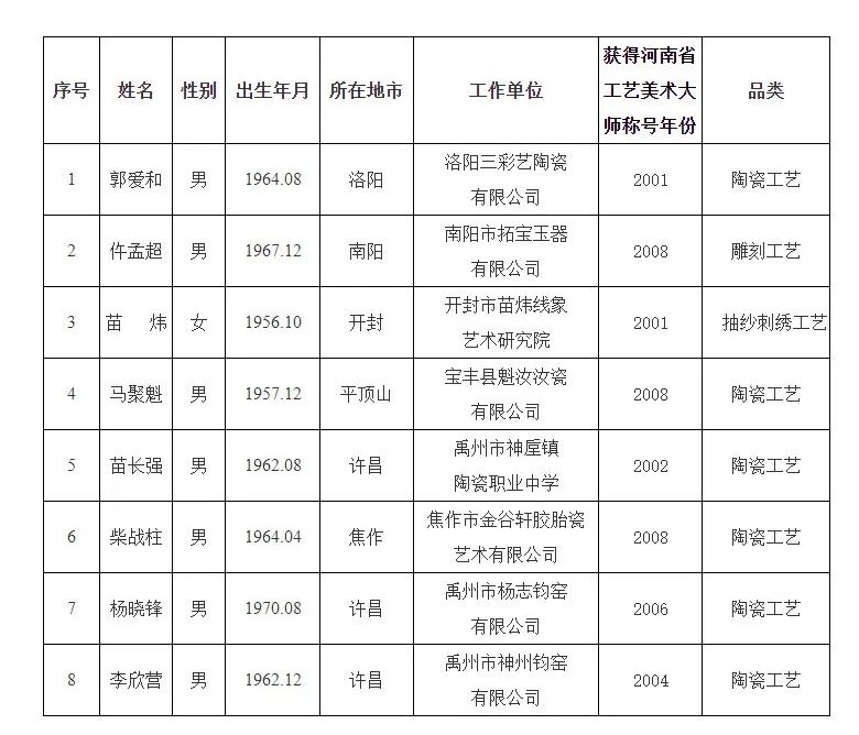 第八届中国工艺美术大师河南省拟推荐人选名单